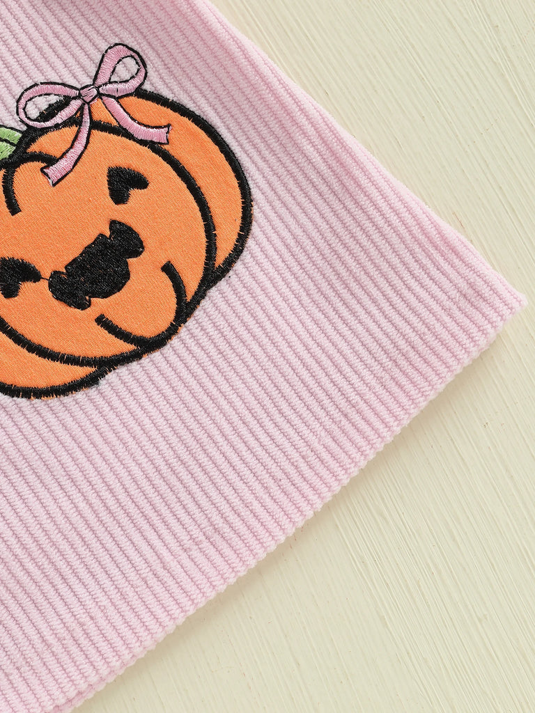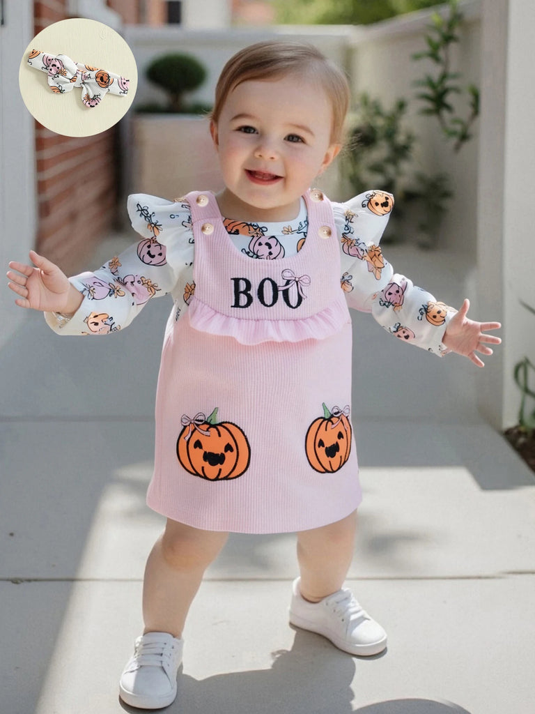 - Long sleeve white romper top with all over orange pink pumpkin print. Adorable matching pink corduroy jumper-dress with embroidered happy pumpkins and BOO across the front.