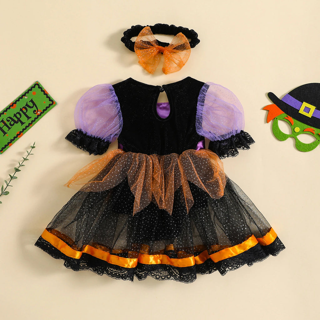 • Adorable little black, purple and orange witch costume with bonus bow headband (hat sold separately).