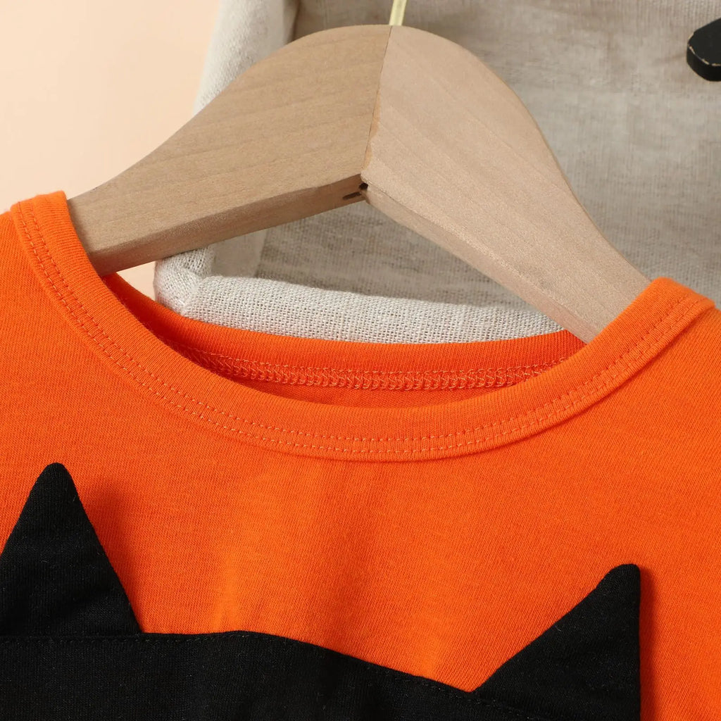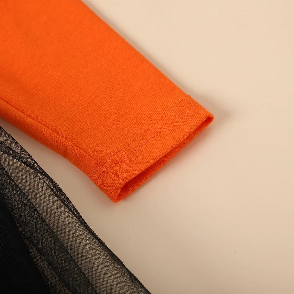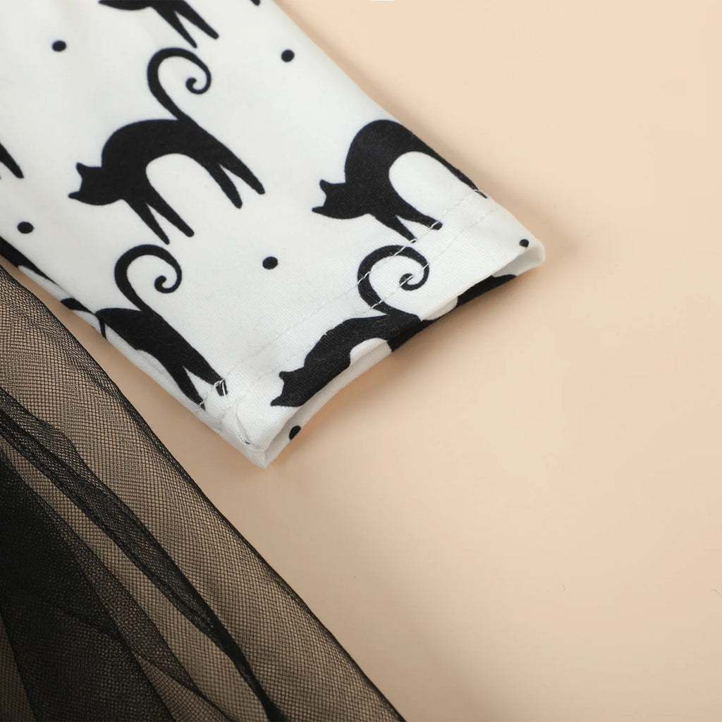 - Long sleeve twirl dress with flutters at the shoulders. Super cut cat eyes and ears at tope with black skirt and tulle overlay. Choose from a solid orange top or white with black kitty pattern.