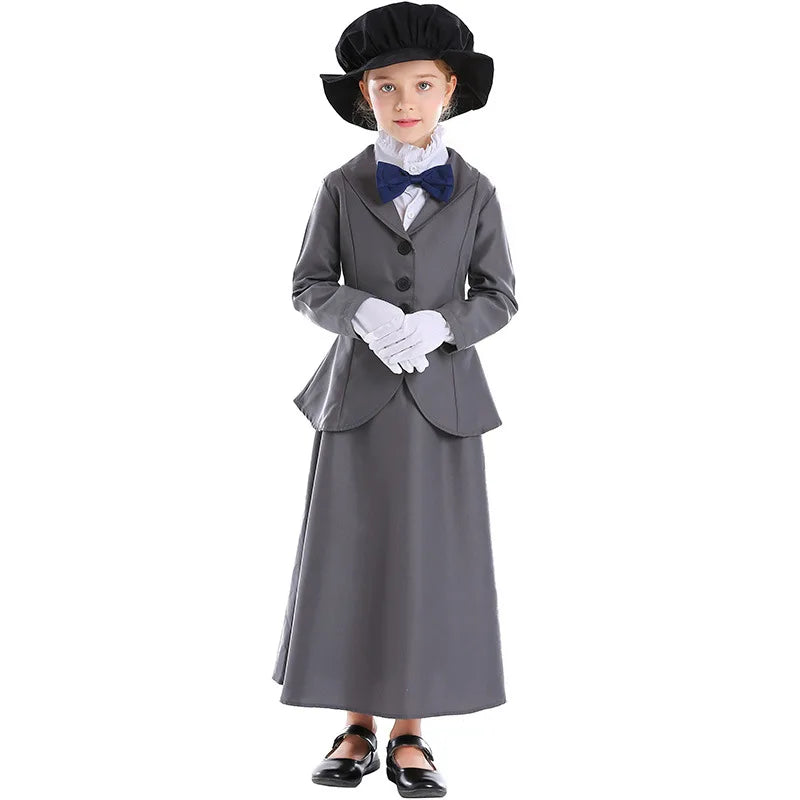 - Adorable English nanny costume with grey button down blazer and floor length matching skirt. White button down shirt with ruffled collar and bow tie. Matching black hat. Matching white gloves.