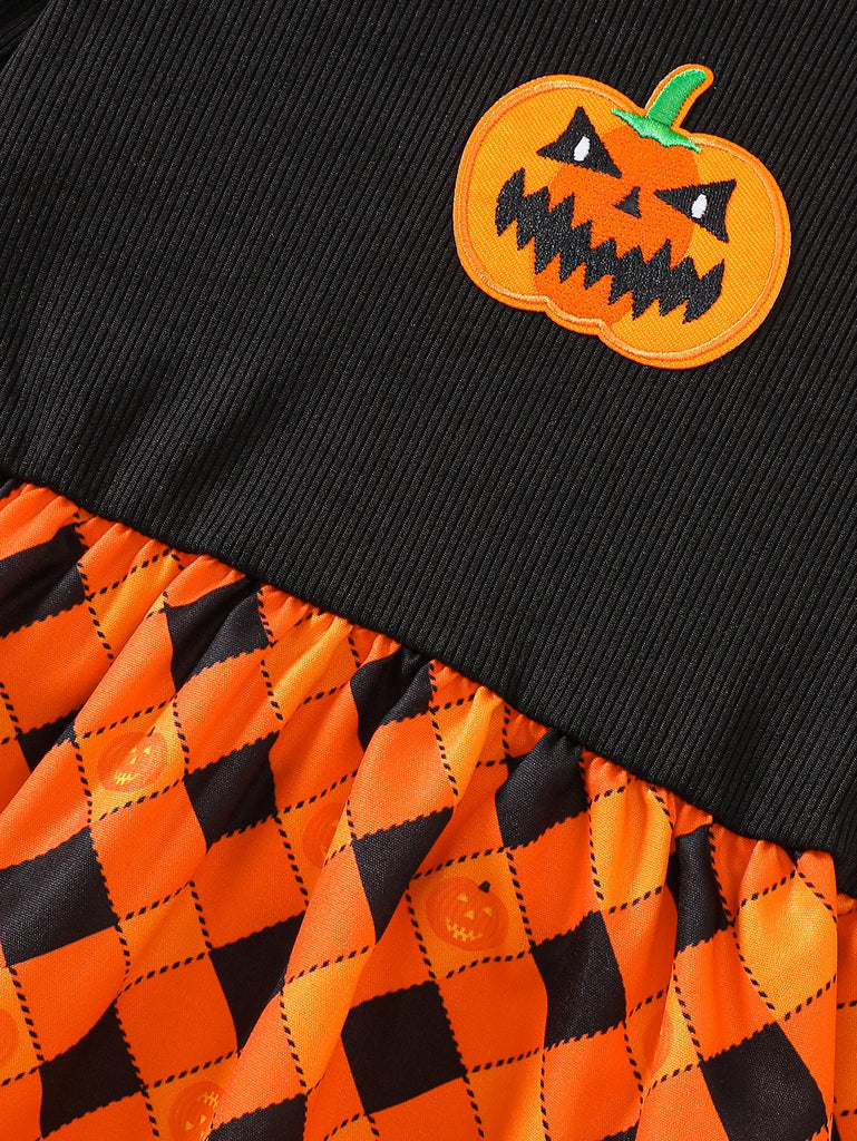 - Long sleeve twirl dress with flutters at the shoulders. Hilarious angry pumpkin face embroidered at chest. Orange and black diagonal plaid skirt.