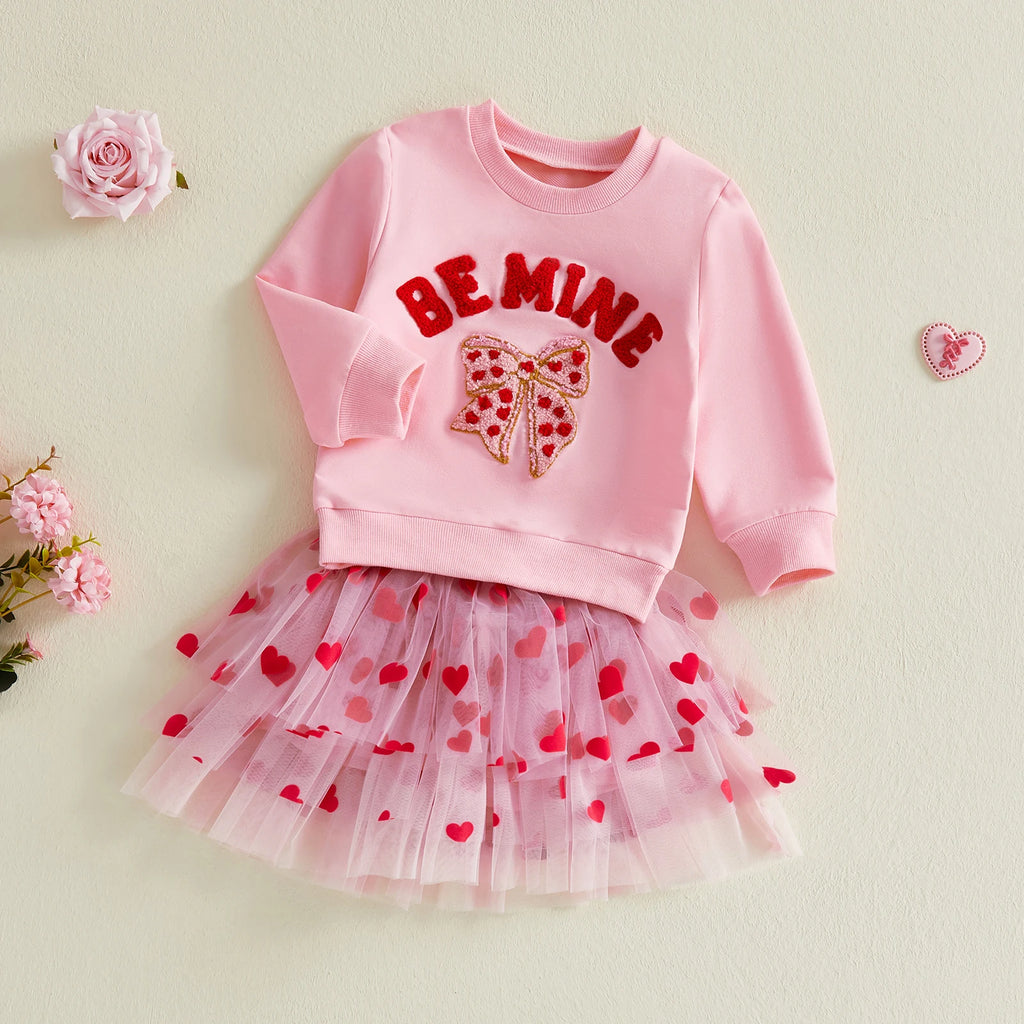 - Long sleeve sweatshirt top with "Be Mine" and a bow embroidered in chenille. Matching pull on pink layered tulle skirt with all-over red heart print.