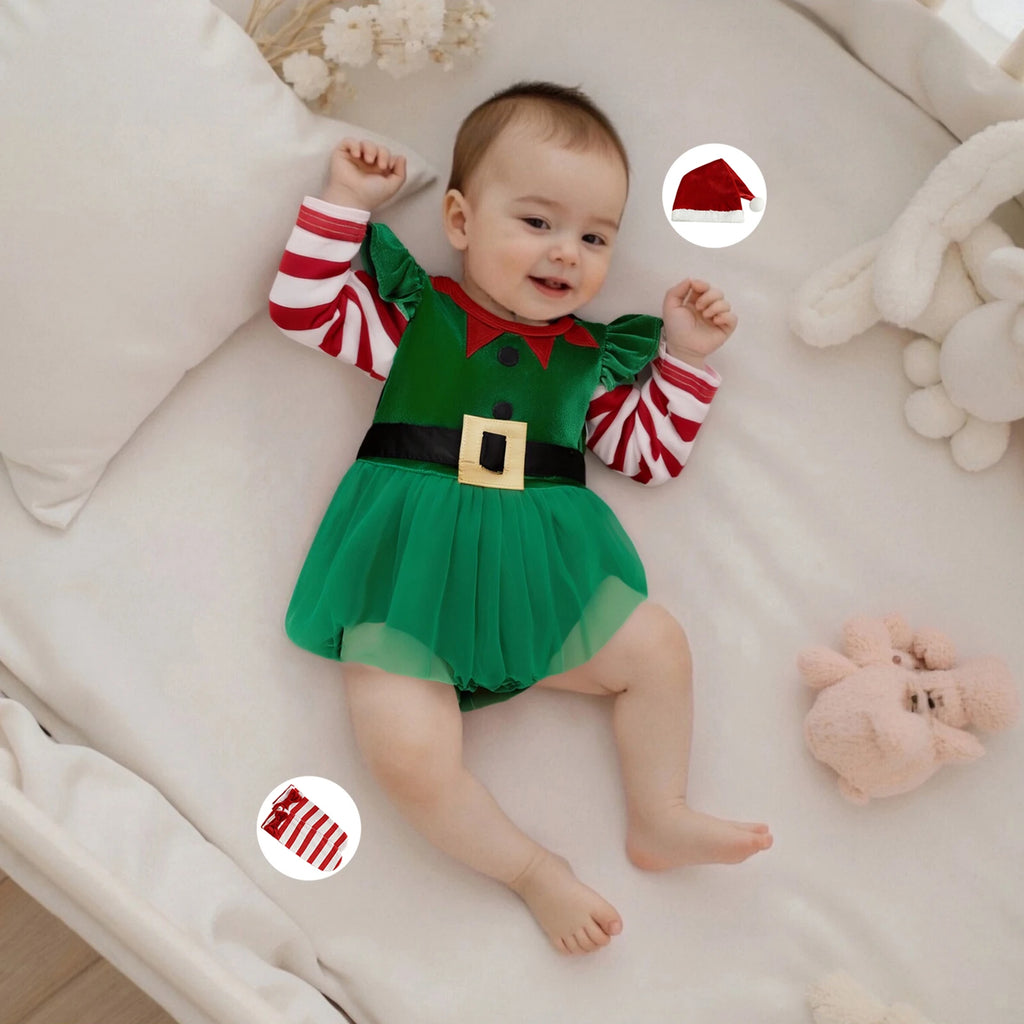- The cutest little holiday outfit! Green belted elfin romper with tulle skirt. Adorable matching candy-striped socks and red Satna hat. Button at bottom for easy on/off and diaper changes. Bonus matching headband.