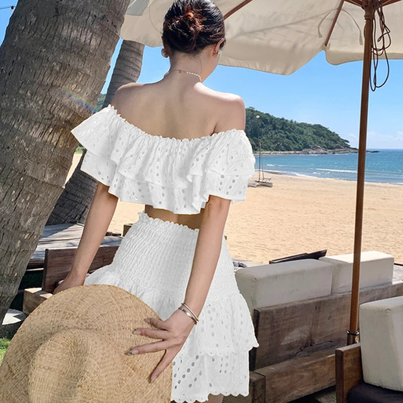 - This absolutely breathtaking mini dress set is the perfect dress for Spring & Summer. Gorgeous strapless top with bardot neckline and layered ruffles at the top. Matching layered ruffle mini skirt. Both pieces have beautiful all over embroidered design and texture. Pretty feminine ruffles at hemline with ruching and super flattering silhouette. A showstopper of a outfit. Super flattering for all body types.
